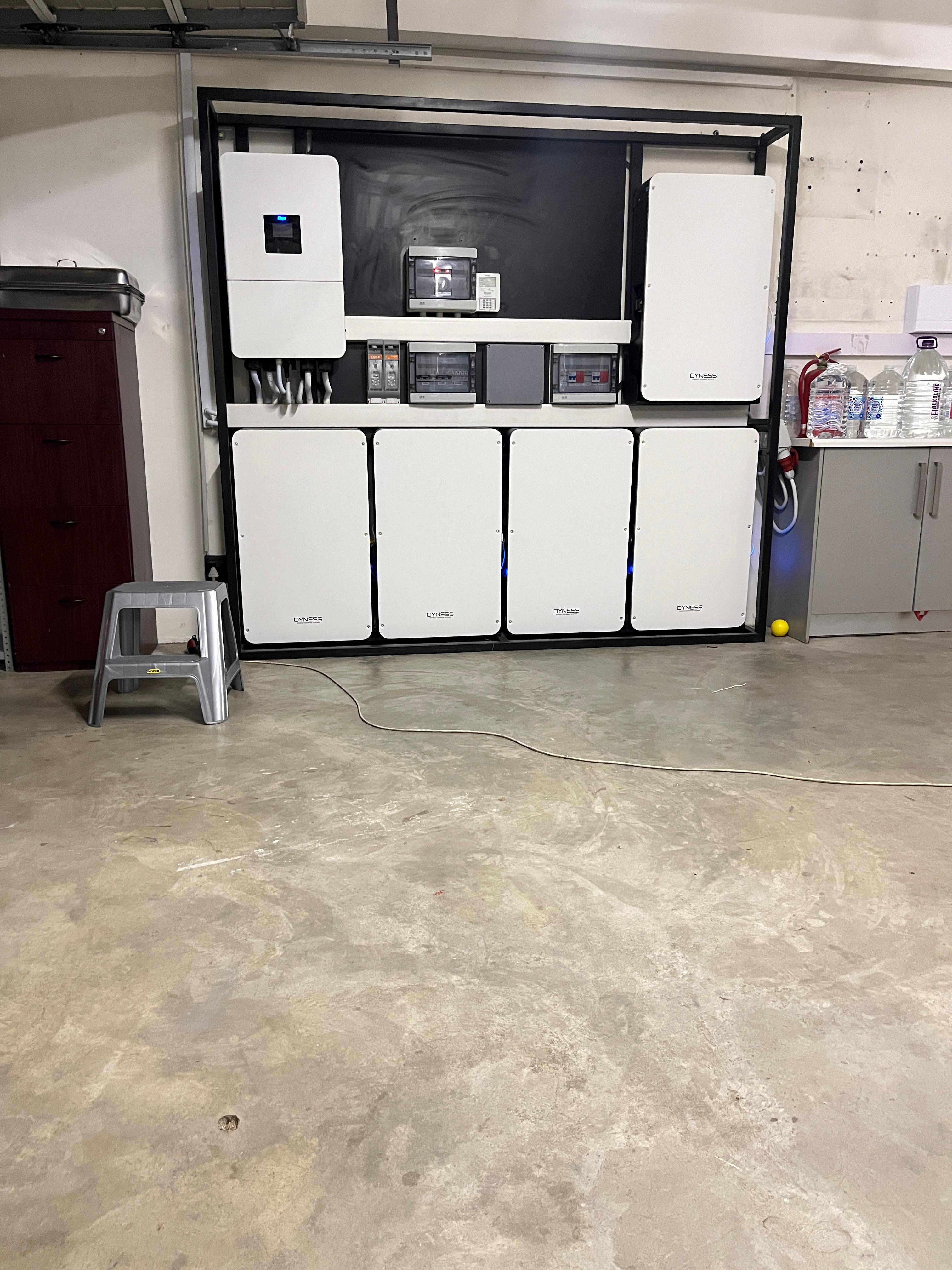 • Solar powers the home/business during the day and batteries supply power at night or during outages.
